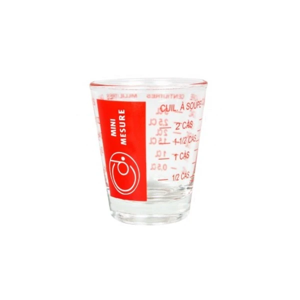 Le mini verre doseur de la marque WAAM possède 5 unités de mesure différentes : cuillère à soupe, cuillère à café, centilitres, millilitres et onces.
