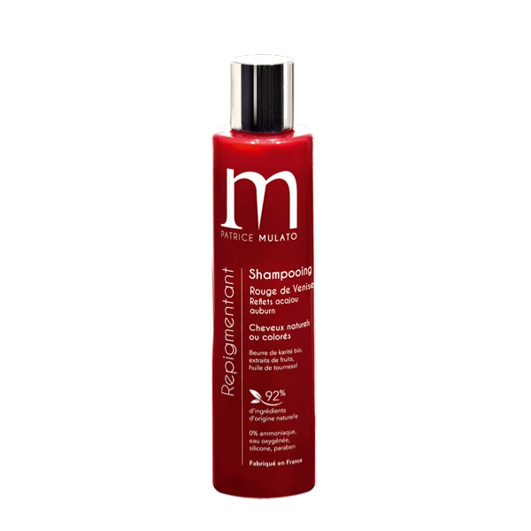 Le shampooing repigmentant naturel ROUGE DE VENISE de la marque MULATO ravive la couleur et donne de la brillance aux cheveux colorés rouge, acajou et auburn.